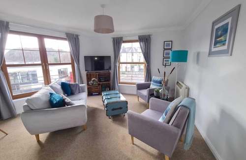 LIVING ROOM: Enjoy looking down on the bustling town centre of Oban from the bright and comfortable living space. Watch the world go by with an evening glass of wine looking across the heart of the town before dining out at one of the many restaurants just a short walk away. The layout includes sofa, armchairs, TV, dining table and chairs seating 4 guests. The space is full of seaside charm and is the ideal home away from home.
