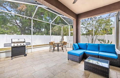 - Outdoor Space: Screened-in lanai with lounge seating, a dining table, and grill, all overlooking a fully fenced backyard, great for kids or pets