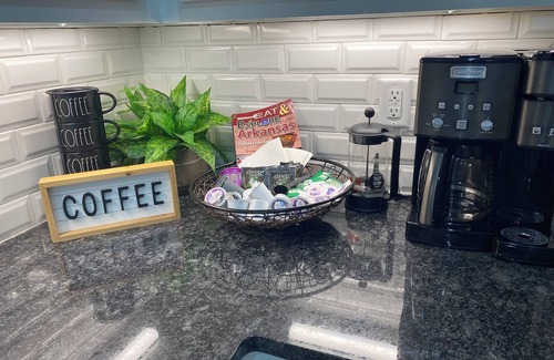 -Inviting Kitchen: Enjoy cooking in a fully-stocked bright white kitchen perfect for preparing your favorite meals. The kitchen includes a coffee station with a keurig machine with pod or full pot option. Also included are refrigerator with built in ice maker and water dispenser and some pantry essentials you may need during your stay.