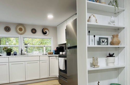 This home offers a comfortable queen bed, Beautiful walk in shower, well-appointed kitchen and more! The living room features a large Samsung flat screen smart tv. The kitchen has everything you need for making a meal in! Enjoy your morning coffee from the keurig and relax on the beautiful back deck.