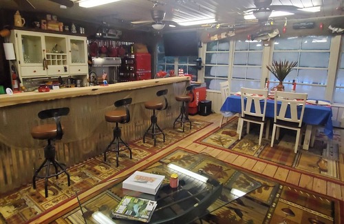 Enjoy a memorable visit when you stay in this unique place, built to give you the lake camping experience, perfect for a couple or small family. Always decorated for the season holidays. This cabin offers allot of entertainment, Surround sound TV and Stereo, Bluetooth Sing- Trix Karaoke with dual mic's, Jukebox with multiple media capabilities to include records, Guitar, Yamaha Piano, Vintage coke cooler, vintage frig, vintage stove, bar lights, ceiling lights, under bed lights, lanterns, strobe lights.