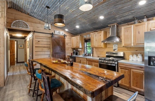 The Desperado Lodge was completely remodeled in 2021 and consists of an open floorplan kitchen, living, and dining area that is ideal for large families and entertaining. The fully-stocked kitchen boasts brand-new, stainless-steel appliances, including a gas stove/oven, refrigerator, dishwasher, and microwave. It is also well-equipped with dishes, cookware, silverware, coffee pot, toaster, electric can opener, crockpot, and more. There is a large, walk-in pantry in the kitchen behind a sliding barn door that provides plenty of storage space and access outside. Through that exterior door is a cooking porch that includes a pellet grill, outdoor griddle, and large, propane fryer available for guests to utilize. The dining table has two leaf extensions and chairs to seat up to eight people. There is also seating for six at the beautiful, custom, sycamore wood island. There is seating for two at the bar area and two more at a table in the living area.