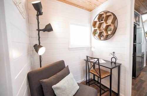The Fortunate Frederick - 004 - Fortunate Frederick is available for your getaway. Multiple outdoor sitting areas with picnic tables, chairs around a cozy fire pit, a front porch swing, a bench with barrel drink rests are ready to enjoy. The interior offers multiple areas to fall asleep at the end of a fun-filled day at Firefly and Fredericksburg, with a queen master on the main, a loft with two twins, fold out bean bags, and a sleeper sofa. You choose where to unwind under the stars. Come enjoy the beautiful tiny home at Firefly Resort! *This unit is pet friendly*