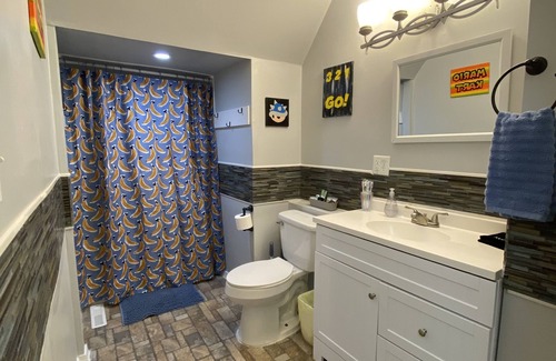 The Gamers Oasis is a fun, gaming themed stay! Arcade games, skiball, working popcorn machine, Monopoly jail Photo Booth, and more! With three bedrooms, 1.5 baths, it’s a perfect place for your next adventure!