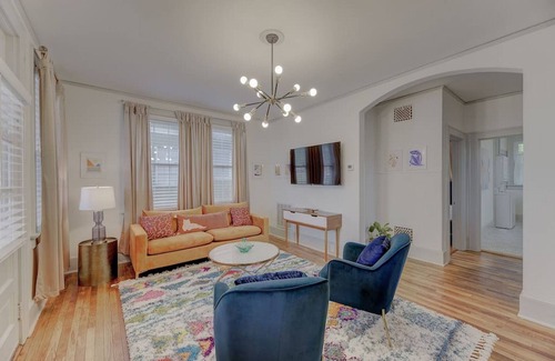 This is the downstairs apartment of a historic duplex that was built in 1930 and completely renovated in 2020. The building is on a busy urban street so expect to hear some road noise inside of the apartment. The entire space has been completely redone and decorated in a splash of gem tones throughout. Comfy velvet upholstery, vibrant art work, glamorous black and brass light fixtures, and colorful vintage glass accessories give the guests of the Gem of Bull Street an extra pep in their step!