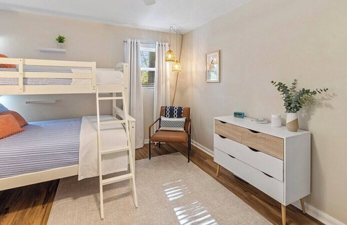 Adorable cottage with front and back porch for relaxing or gathering with family and friends. Home contains three bedrooms - primary room with king bed and private bath. Guest room also has king bed. Large bunk room that sleeps 4-5 and has all the amenities for your kids. Shared bathroom in the hallway.
