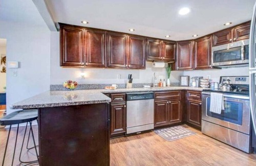 We have a large, open style kitchen with all stainless steel appliances including refrigerator, stove, dishwasher, and microwave. In the cabinets you will find plenty of high quality cookware, glasses, plates and utensils for preparing meals. Plus enjoy our Keurig coffee maker with complimentary K cups provided for your stay!