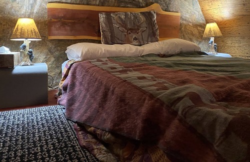 The Hunting Cabin has a large entryway with extra refrigerator perfect for your supplies and outdoor gear. Inside there is a comfortable living room with plenty of seating and eating bar. The kitchen is fully equipped with refrigerator, sink, coffee makers, microwave, countertop oven, George Forman grill. Off the kitchen is a shower stall with hot and cold water. The cozy sleeping loft has a drop down ladder and queen size bed. The couch also folds out to a queen size bed. The heated flush toilet is located in an outbuilding a few steps from the cabin.