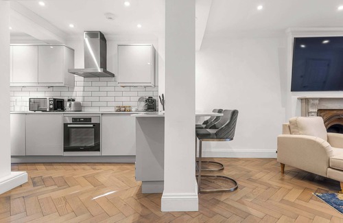 The flat features a generously proportioned living area, designed to maximize space and light despite its lower ground floor setting. Thoughtfully decorated with modern furnishings and neutral tones, the space is both inviting and functional—ideal for relaxing or hosting guests. The sleek, fully equipped kitchen boasts high-end appliances, ample storage, and sophisticated finishes.