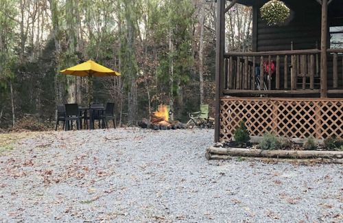 The fire pit area is to the left of the cabin. We provide some racks for grilling right on the open flame. There is also a charcoal grill(charcoal not provided) we have grill specific utensils. There are a few outdoor tables set up for your convenience. Grab a camp chair, s’mores stick and toast your marshmallow to perfection around the open fire.