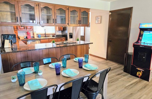 This home is a side-by-side duplex, being roughly 1200 square feet total. It offers a full-sized kitchen, with everything needed to cook a family dinner. Beautifully remodeled full bathroom. An additional shower in laundry room as well. We offer a king size bed and two twin beds with ample storage for clothes and a dedicated work space for traveling workers. In the living room we offer a queen sized pull out couch with the Roku TV, an Arcade machine with 14 built in games.