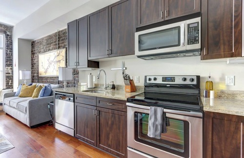 A small dining set sits directly off the kitchen and is set for four. The living room boasts an oversized comfortable sofa and smart TV set up for your favorite streaming services. Accented by a beautiful, exposed brick wall, industrial ductwork, and sleek décor you will be living the urban loft lifestyle as you sit and relax at the end of the day.