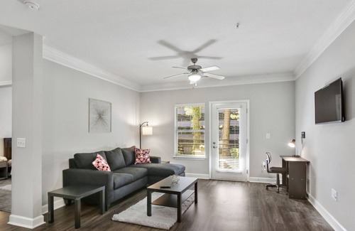 This apartment that provides comfort, relaxation, quiet time & has an amazing pool & gym which are great for longer stays. This property has beautiful amenities, stainless steel appliances, washer-n-dryer, complimentary snacks, water, coffee, and hot tea. 1 Queen Size Bed & 1 Queen Air Mattress, full bathroom with a tub & shower , a washer & dryer & full kitchen, bar top & full kitchen table & study desk.