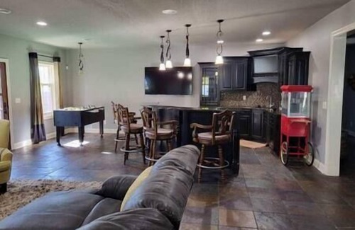 Full Wet Bar: The bar has seating for four individuals, a 65" LG Tv, a wine cooler, and drinking glasses for any spirit including Whiskey glasses, Margarita glasses, Martini glasses, and of course copper mugs for Moscow Mules!