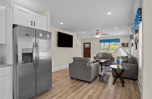 Cook and stay connected to the rest of the action in the open concept space connecting the kitchen, living, and dining areas. This fully equipped kitchen makes meal prep a breeze. There is ample space for multiple chefs to team up at once. All necessary utensils and equipment needed for cooking are found in this kitchen. We provide a Keurig combo coffee maker for K-cup lovers and drip coffee lovers alike!