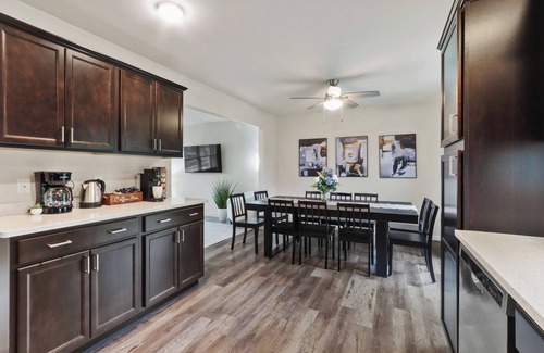Kick back and relax in this calm, stylish private home and enjoy the big outdoor space. This is a 4-bedroom, 3-level private residence that offers a peaceful retreat near all the fun. The property is perfect for couples, families & friends looking to make special memories. This home is only four years old and is decorated in modern industrial style. Enjoy three levels of modern conveniences, including games, flat screens and outdoor apaces.