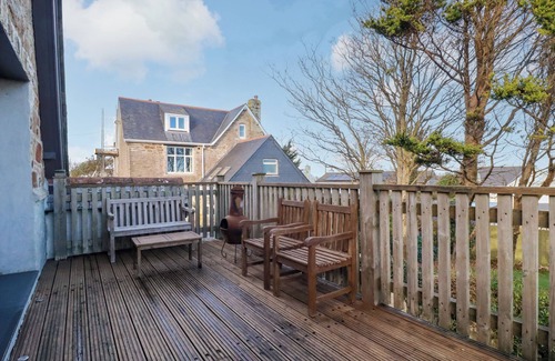 Amenities: Central heating. Electric oven and hob, fridge, kettle, toaster. TV, WiFi, selection of books. Fuel and power inc. in rent. Bed linen and towels inc. in rent. Highchair and travel cot available on request. One well behaved dog welcome. Off-road parking for 2 cars. Private decked balcony with furniture and an astroturfed garden. Sorry, no smoking. Shop 0.3 miles, pub and beach 0.4 miles. Please note : This property does not accept short breaks during peak times.