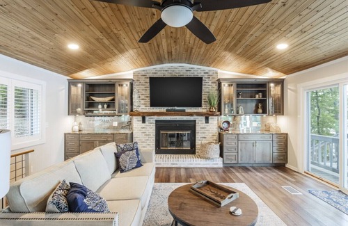 When you first walk in, you will see the large kitchen and comfortable living space. The kitchen has a large island with seating, as well as a bar overlooking the lake. It is stocked with all the essentials needed to cook/ entertain for your stay!
