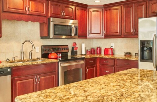 The KITCHEN has beautiful cherry wood cabinets, granite countertops and stainless steel appliances (refrigerator, stove/oven, microwave and dishwasher). It is fully stocked with pots/pans, knives, cutting boards, cups, plates, silverware and coffee maker. Plastic plates and cups are provided for use outdoors and around the pool. The kitchen island faces the living space, and it has a breakfast bar with 2 bar stools.
