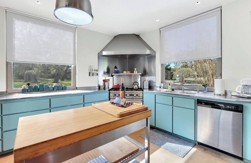 The kitchen is a dream for foodies and entertainers alike. Outfitted with a commercial-grade gas range, stainless steel counters, a butcher block island, and ample dishware, it’s built to handle everything from weekend brunch to special occasions. A large elm dining table seats 10, and the great room beyond invites guests to unwind by the limestone fireplace in plush leather seating.