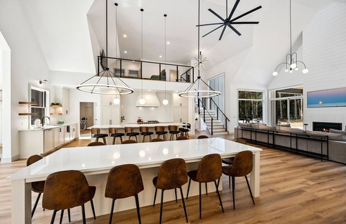 The open-concept living and dining areas boast soaring ceilings, large windows, and clean Scandinavian lines, creating a warm, light-filled space ideal for gathering. The fully equipped kitchen is outfitted with high-end appliances and generous counter space—perfect for preparing group meals or late-night snacks.