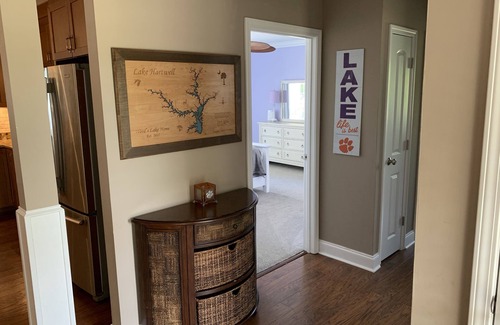 A very unique and premier rental on Lake Hartwell directly across the lake from Clemson University. Capture the views of Tillman Hall, Death Valley, and the Walker Course from your living room, porch, and bedroom windows. This home sits just three miles from Clemson University. One of the best lakefront rental properties in this area with an unobstructed view of beautiful Lake Hartwell. This home features four bedrooms with two master suites. Open floor plan allows for large family gatherings. Relax outside on one of the two large porches. Underneath the new addition offers another large and shaded area that could be used for entertainment.. Bring your own boat or rent from Clemson Marina. Clemson Marina is within walking distance and offers boat rentals, gas, dining, and a playground for kids. The dock associated with this house is one of the largest covered platform docks allowed on this lake and sits in deep water. The shoreline also consists of approximately 150 feet of white sand. This is a family owned home that is very clean, updated, and well maintained. Property also offers a very spacious front yard that could also be used for recreation. Cornhole boards are included. The perfect getaway home for vacation and/or Clemson related events.