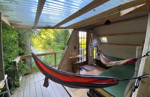 Located on the grounds of the Duckpond Pottery, The Quack Shack is a secluded treehouse perched along the banks of the French broad River. The structure is an enclosed 8x10 A-frame that transforms via a hinged wall to become an open air cabana with an expansive deck affording spectacular views of The French Broad River and surrounding countryside. The interior of the Quack Shack, with its vaulted 11 foot ceiling and earthen plaster walls feels more Italian villa than shack. It is furnished with a comfortable seating area surrounding a coffee table that at night can be easily converted to a full size queen bed. On the outside deck are beach chairs, hammocks, and a chimnea available for use. The quack shack has electric power.