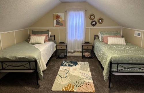 This house features a queen bed that sleeps 2, a sleeper sofa that sleeps 2, and two twin beds that sleep 1 each for a total of 6. There is a shower in the upstairs bathroom, and a bathtub shower combo in the downstairs. The kitchen has full sized appliances and is supplied with dishes, cooking and baking ware, cutlery, a Keurig, toaster, and blender.