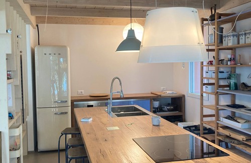 The house finds a great part of its energy in the sun, through a solar panel system, so there is no gas inside the home, neither for cooking, nor for heating, so there is an induction hob and electric oven.