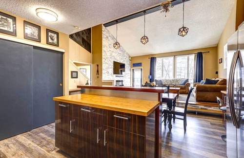 The cozy interior boasts a large gourmet kitchen, vaulted ceilings, mountain views, games, and a fireplace. Upstairs has a private master bedroom (king sized bed) with private bathroom. Main floor has a large bedroom with two queen beds and an attached bathroom.Three showers (3/4 baths) are throughout the unit. Sleeps 8; pull out couch in living room