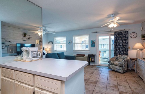 The home’s bright and fresh interior is a welcome sight at the end of long days spent in the sun, with cool tile flooring and soothing neutral tones helping to keep the heat at bay. The chic, coastal inspired décor ensures that the themes of sand and surf remain close to mind. Spend your well-earned downtime relaxing in the living room on the comfortable sofa or armchair while you stream episodes of your favorite show on the smart TV. The quaint kitchen comes well-equipped and ready to assist in preparing light meals and storing all your food supplies. Hop up to the counter on the high-top stools to enjoy a quick bite before heading out the door. Start your day off right with a fresh cup of coffee and step out onto the balcony to enjoy it in the plentiful sunshine as you breathe in the fresh ocean air.