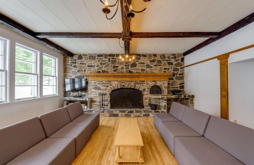 A monumental stone fireplace adorns the living and dining room which used to be one of the two classrooms. The other classroom has been subdivided into three large bedrooms.