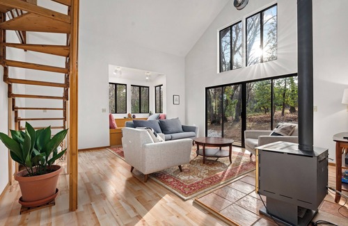 Our home features a welcoming and open design that seamlessly blends indoor living with the natural surroundings. The main entry to the house has a covered porch, which invites you through the front door. Once inside the house, a workspace opens into the full kitchen and dining area. The kitchen is fully equipped with everything you need to prepare a beautiful meal, including a gas range, appliances, and a wide variety of kitchen utensils. The dining area features a table with seating for six and a large glass sliding door overlooking the rear covered deck and backyard. Just past the dining room is the large living area with seating oriented around the fireplace, vaulted ceilings, abundant natural light, a custom hand-built loft stair, and an exterior deck overlooking the property. The primary bedroom and loft are accessible off the living space and both feature king-sized beds, closet storage, and fresh linens. The primary bedroom also features a private balcony overlooking the garden and forest.