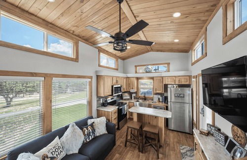 The Wandering Hound - 008 - Appropriately titled, The Wandering Hound for the two hounds seen in the photo album (Hank & Harley), this pet-friendly rental is ready for your four-legged loved ones as well. This tiny home comfortably sleeps four (two-legged friends) with the upstairs loft beds and the downstairs master. The log cabin-style tiny home is the only one of its style at Firefly Resort. The oversized porch offers a ceiling fan with rockers to cool off in the shade. Between the sunsets and the night stars, there is always a view here in hill country...especially from this grand porch in the evenings! *This unit is pet friendly*