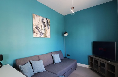 The open plan kitchen/living area has everything you need for a short stay or longer with a breakfast bar overlooking the high street, coffee machine, fridge & freezer, electric hob and oven, microwave, toaster, kettle and washing machine plus an array of utensils to cook up a gourmet meal on an evening in where you can settle down and cuddle up on the corner sofa in front of the 42" TV with Netflix included in your stay.