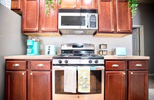 Fully appointed modern kitchen with stainless steel appliances, including stove, oven, refrigerator, and microwave. Bedrooms are uniquely themed and comfortably furnished with fresh crisp new linens, pillows, bed coverings, and 40" Smart TVs. Master bedroom features a private en-suite bathroom with a walk-in shower and garden tub.