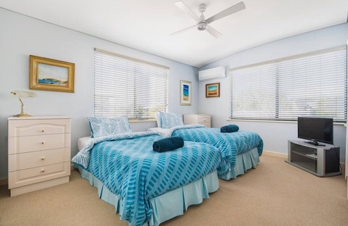 The bedroom configuration upstairs is with the master bedroom having a King bed and en-suite, one queen bedroom and three king singles in the third bedroom. Seven persons sleep comfortably upstairs. As noted above, fourth and fifth bedrooms and extra bathroom are downstairs if your numbers require. Bedroom 4 on the ground floor is spacious and has a queen bed and a single. Bedroom 5 has a king bed, so the house can sleep a maximum of 12 people.