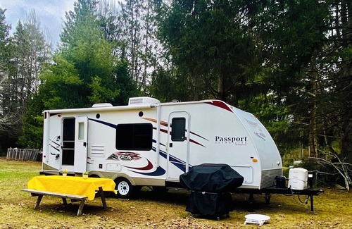 Escape to nature with a stay on a large, private lot along the crystal-clear water of the Cheboygan River, which connects to Lake Huron and Mullett Lake. This is the perfect spot for swimming (sandy), our 26’ camper featuring indoor plumbing, a fully equipped kitchen, and a bathroom for your comfort—glamping at its finest!