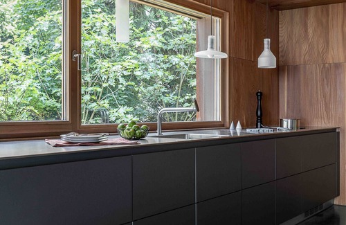 Its creator wanted it to be long, guiding the eye towards the horizon and inviting it to get lost in the distance on the lake. Made entirely of wood, black steel and concrete, the impressive ceiling height is supported by cathedral windows and a large patio window.