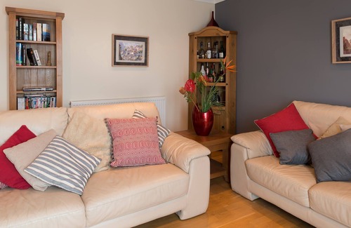 This second-floor apartment sleeps four guests in two bedrooms and benefits from private off-road parking. Enter the accommodation into a spacious hallway where you can kick off your flip-flops or wellies and store your beach bags. The living room features two leather sofas, a large flat-screen TV, and doors that open to a Juliet balcony.