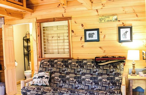 Enjoy your stay at the all new Tiny Bear luxury Log Cabin, Tiny home style! Sleeps up to two adults. Fully equipped kitchenette including stove, microwave, sink, and refrigerator. The living room features a comfy futon, making a full size bed. Small flat screen television with Dish network. Wifi included with your stay. A bedroom with a full size bed and an electric fireplace. The cabin is tastefully decorated and carries a rustic cabin theme throughout. Enjoy the peace and tranquility in the Tiny Bear Log Cabins hot tub on the front porch overlooking the firepit and large pine trees, firewood is included with your stay.