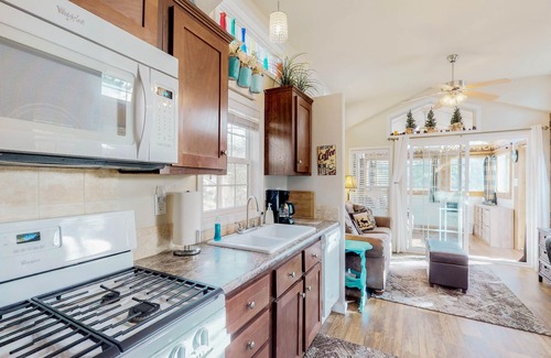 You will enjoy all the comforts of home in this unique tiny home. It features one bedroom with a queen-size bed and two night stands. The living room, kitchen, and dining area are all open. The full bathroom has a walk-in shower.