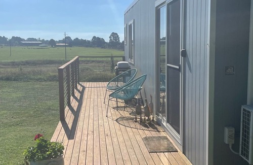 This is an eco friendly tiny house, that has a queen sized bed and a fold out lounge for a 3rd guest. The tiny house's amenities include a split system air con, a kitchenette where you can cook light meals, a portable electric cooker, cooking utensils, cutlery, dishes & silverware, microwave, and even a mini fridge.