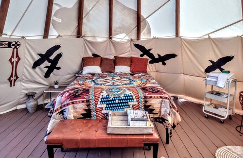 Perfect Romantic Get-Away To Leave Technology Behind! This Gorgeous 22 Foot Tipi Includes 27 Foot Lodge Pine Poles & Hand Painted Art. Enjoy The Comforts Of The Queen Bed, Heating & Air Conditioning, Mini Frig & The Coffee Station. Relax & Unwind In Your Private Bubbling Hot Tub While Surrounded By Flickering Tiki Lights & A Roaring Campfire. During The Day, Enjoy A Round Of Disc Golf, Explore The Shallow Creek, & Of Course, Bring The Charcoal. This Unique Glamping Experience Is Fun For A Couple, Small Family Or An Individual Simply Wanting To Get Away