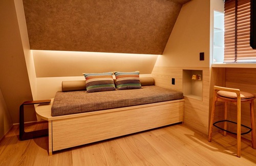 The elevator hotel has five independent suites with one suite per floor offering guests privacy Each suite is elegantly furnished with a work area suitable for small families or business travelers The hotel also offers a laundry room / This guest room is located on the 6th floor the only guest room on this floor The entire space is about 19 square meters with a sofa bed that can be unfolded into 2 single beds There is a simple office space by the bay window There is a kitchenette but without a stove and sink The kitchenette is equipped with a Nespresso coffee machine microwave oven a rice cooker and other cooking equipment that does not produce smoke The room is fully equipped and convenient for longterm stay