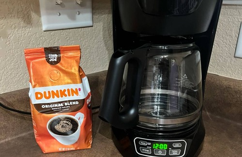 - Coffee maker with coffee, tea, sugar provided.