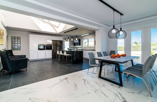 On our way inside you will find an outside dining table, perfect for lunch or alfresco dinners outside. The villa has one larger area to hang out on inside which contains a sofa with a TV and a direct entrance to the open kitchen. Floor heating through the whole house.