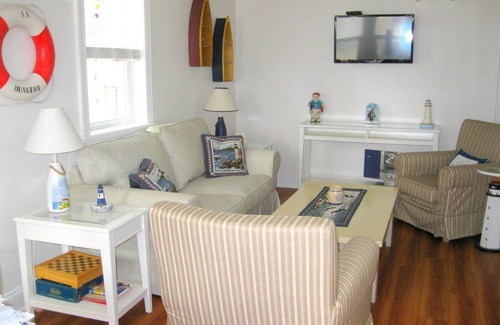 Totally rebuilt ground floor unit including studs and joists. Reconfigured to create a charming, open and airy living/kitchen/dining area concept. Located in the historic North End beach block (10 houses form the guarded beach & boardwalk). Decorated "seashore chic" with air conditioning, wireless internet cable TV and DVD. 2 bedrooms and 2 baths (1 with a stand up shower in the master & 1 with a claw footed tub) to satisfy all. The enclosed outside shower is shared with the upstairs unit. This ground ground floor condo is perfect for a small family of 4. Please note it is a ground floor condo with lower ceilings (7') & exposed hanging ceiling pipes (just over 6') (see picture) - not recommended for people over 6'.
