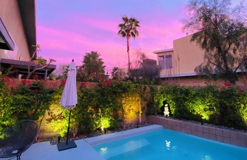 Contemporary two-story 1800 sq ft townhome w/ private pool in S. Palm Springs convenient to everything. Walk to Koffi, Ace Hotel, Villa Royal, Elmers, and more. 1.5 miles to downtown PS. Private courtyard w/ pool/spa and natural gas grill. Quiet, smaller condo complex. Upstairs is the primary bedroom/bath, laundry room, and den/office which looks down onto the living room with 20-foot ceilings. Guest bed & bath downstairs. Garage for one car. Enjoy a stylish experience at this centrally-located place. NOTE: During high season (Jan/Feb/March/April) there is an additional fee to heat the pool (see custom fees).