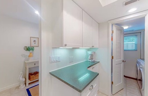 Two-story townhouse in the heart of Coligny area - 2 bed/2.5 bath, sleeps 8. Lower floor opens to a fully equipped kitchen with a coffee/tea station, dining area, half bath, and living room with a queen-size pullout couch, smart TV, games and books for your use during your stay. Walk out to a patio with outdoor dining area and gas grill and the shared courtyard and community pool (not heated).